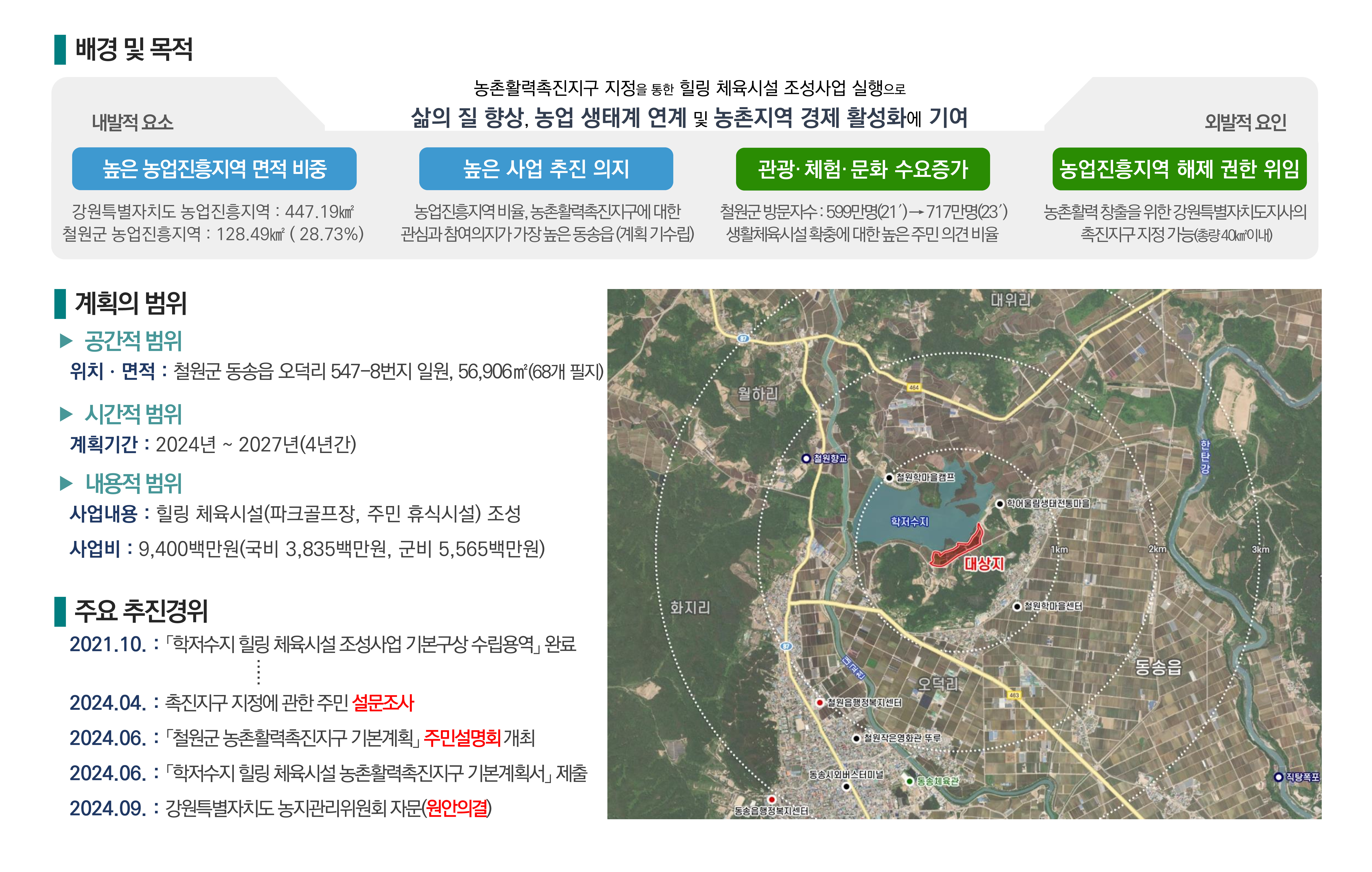 본 용역에서는 철원군 내 농촌활력촉진지구 후보지 가운데 학저수지 힐링 체육시설 조성사업을 우선 지구 지정 대상으로 선정하여 천혜의 수(水) 경관을 배경으로 한 다목적 힐링 공간 조성으로 여가 공간 창출,