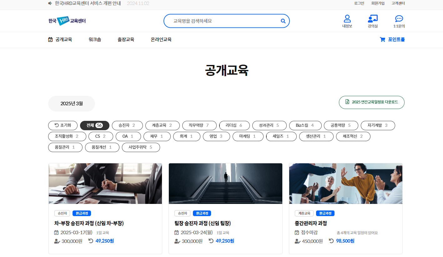 한국HRD교육센터는 종합교육 및 경영 컨설팅을 지원해 주는 교육센터로 공통역량, 계층 역량 승격/승진, 리더십, CS/서비스, QA, 인사총무, 재무/회계, 온라인 마케팅, 영업/세일즈,