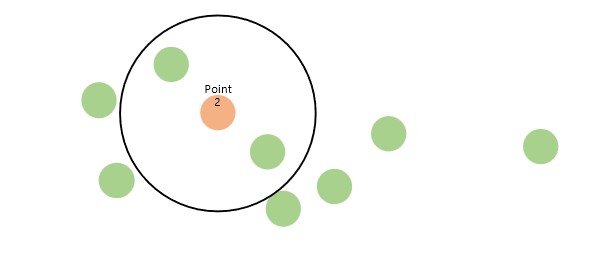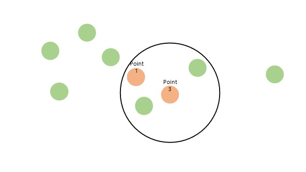 예를 들어 거리안에 자신을 포함해서 3개의 점이 있을 때 군집이라고 인식한다면 아래 그림의 포인트1은 중심점이라고 할 수 있습니다.