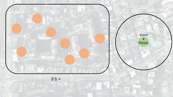 마지막으로 어떤 점을 중심으로 해도 범위에 포함되지 않으며, 어느 군집에도 속하지 않는 Point4와 같은 점은 Noise라고 합니다.