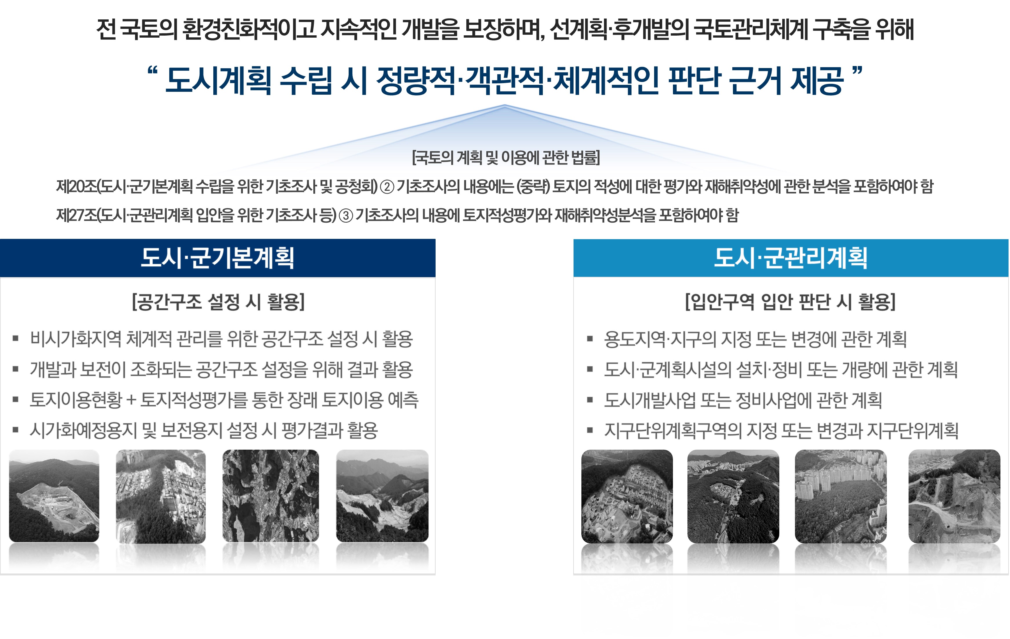 「국토의 계획 및 이용에 관한 법률」에 따라 도시기본계획 및 도시관리계획 수립 시 기초조사로 토지적성평가 및 재해취약성분석을 실시하도록 하고 있습니다.