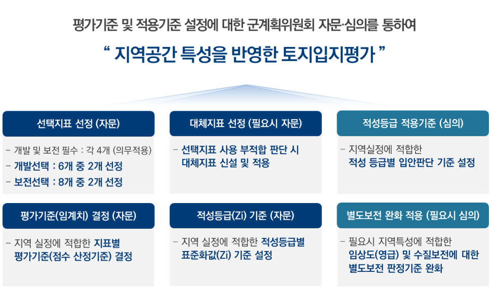 토지적성평가는 선택지표 선정, 대체지표 선정, 지표별평가기준, 적성등급 부여 기준 설정의 4가지 도시· 군계획위원회 자문사항과 적성등급 적용기준,