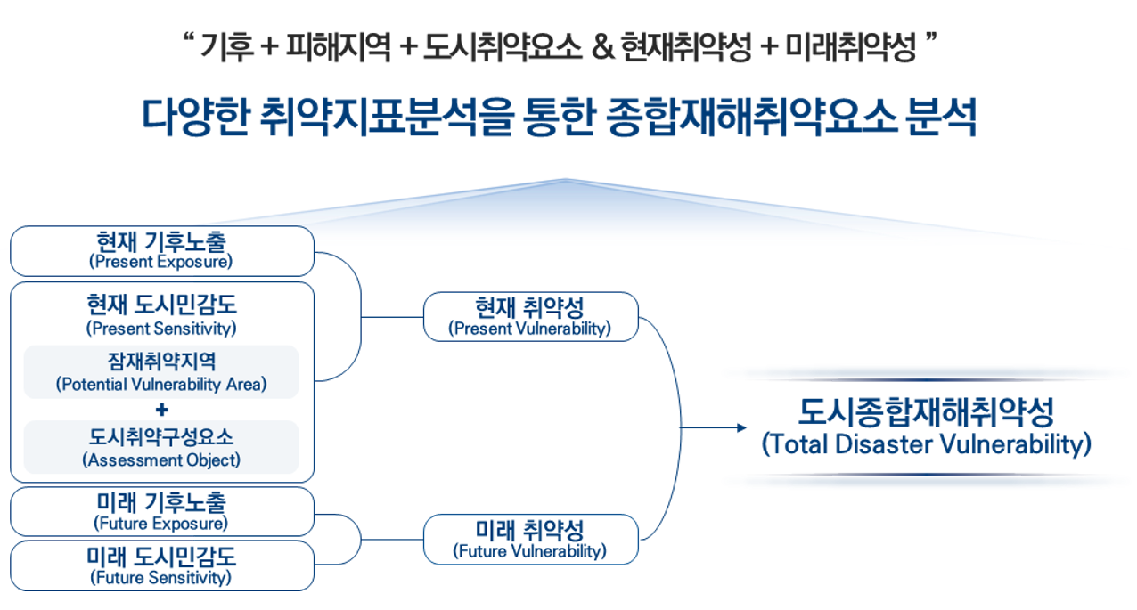 재해취약성분석은 IPCC 기후변화 재해취약성분석의 골격을 유지하면서 기후노출과 도시민감도를 고려하여